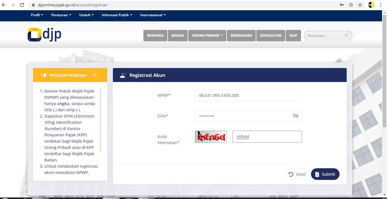 Dapatkan EFIN ( Electronic Filing Identification Number) di Kantor Pelayanan Pajak (KPP) terdekat bagi Wajib Pajak Orang Pribadi atau di KPP terdaftar bagi Wajib Pajak Badan. Untuk melakukan registrasi akun masukkan NPWP, EFIN, dan Kode Keamanan dengan benar, kemudian klik tombol Submit untuk ke tahap selanjutnya. Registrasi Akun NPWP* EFIN* Cara daftar efin djp online bisa dilakukan dengan mudah lewat hp. Cara daftar efin lewat email atau WA KPP yang terdaftar tentunya harus teliti dan memerhati.